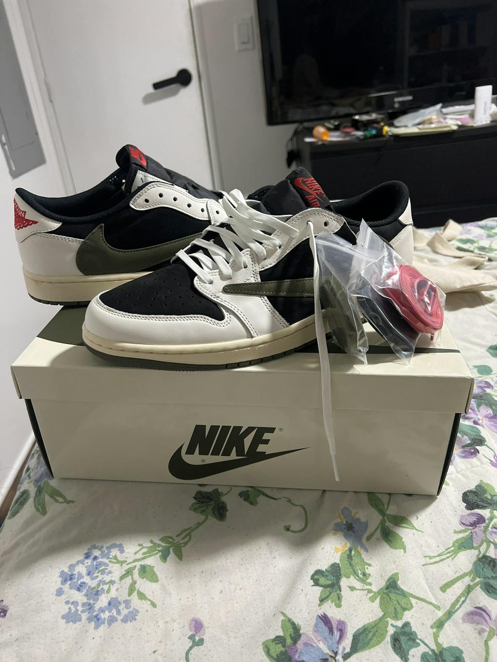 Introducing the highly anticipated Air Jordan X Travis Scott 1 Low OG SP in Olive (W), a collaboration between icons in the sneaker world. This sneaker boasts a unique design, featuring a reverse olive swoosh that adds an eye-catching twist to the classic sneaker.The aged yellow midsole perfectly complements the black suede and soft white leather panelling, creating a stylish and versatile look that we are used to seeing with every Travis Scott pair!